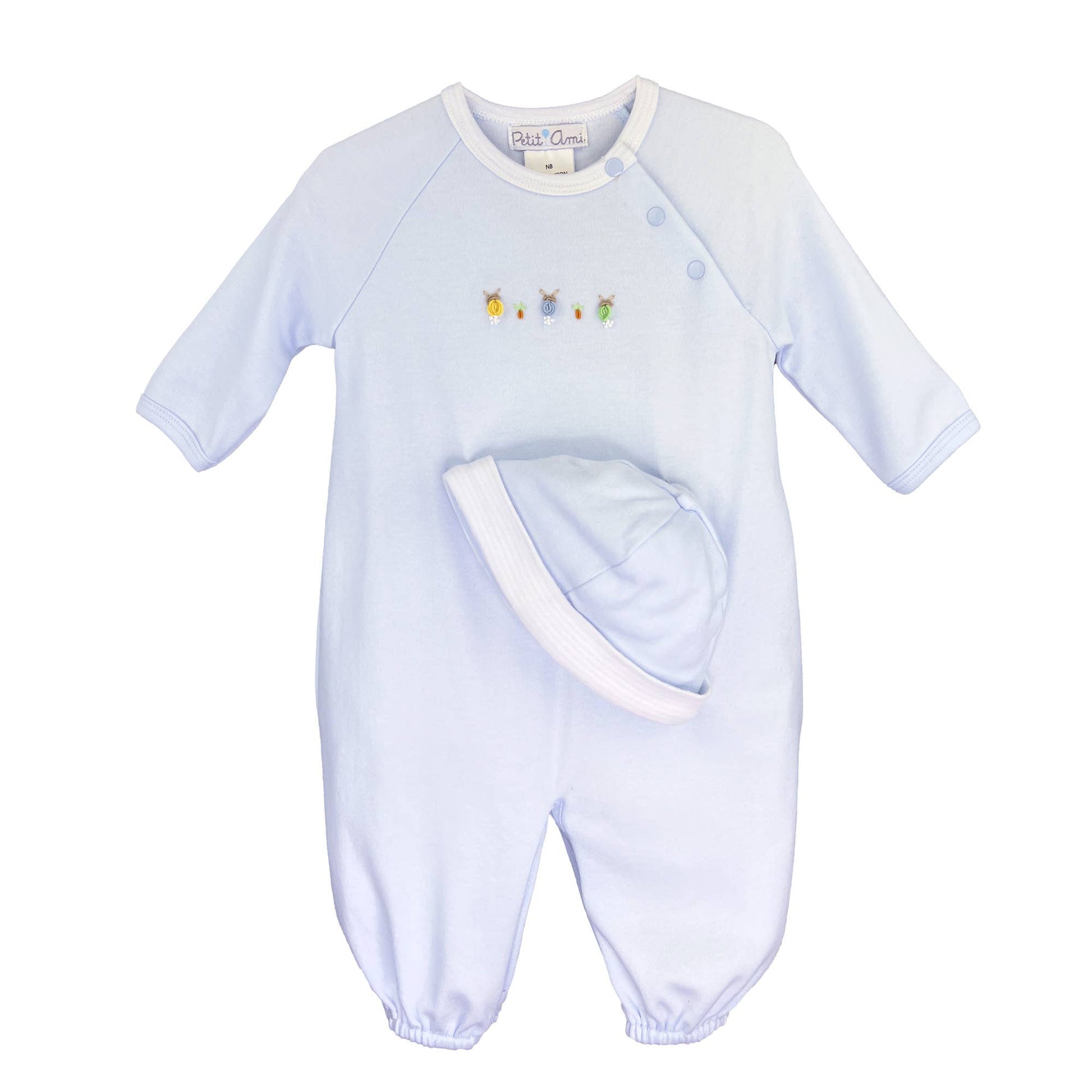 This beautiful bullion bunny knit bag is soft and comfortable, made with 100% cotton this outfit is perfectly soft for baby! Featuring a delicate light blue interlock knit fabric with adorable bullion embroidered bunnies on the front, this outfit is perfect for babies first Easter! This bag is designed to snap apart at the bottom to convert into a long all, giving you two outfits in one! The lightweight cotton fabric keeps little ones cool and comfortable and is easy to care for – just machine wash and tumble dry. Matching hat is included.