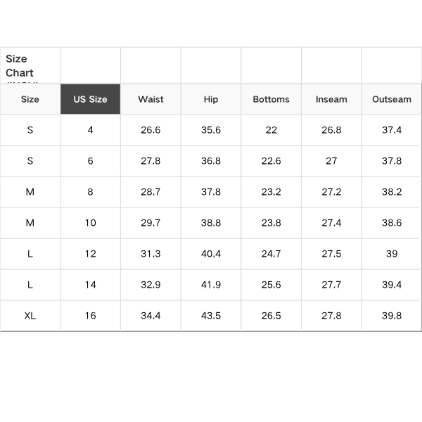 Size Chart (INCH) Size US Size Waist / Hip / Bottoms / Inseam / Outseam