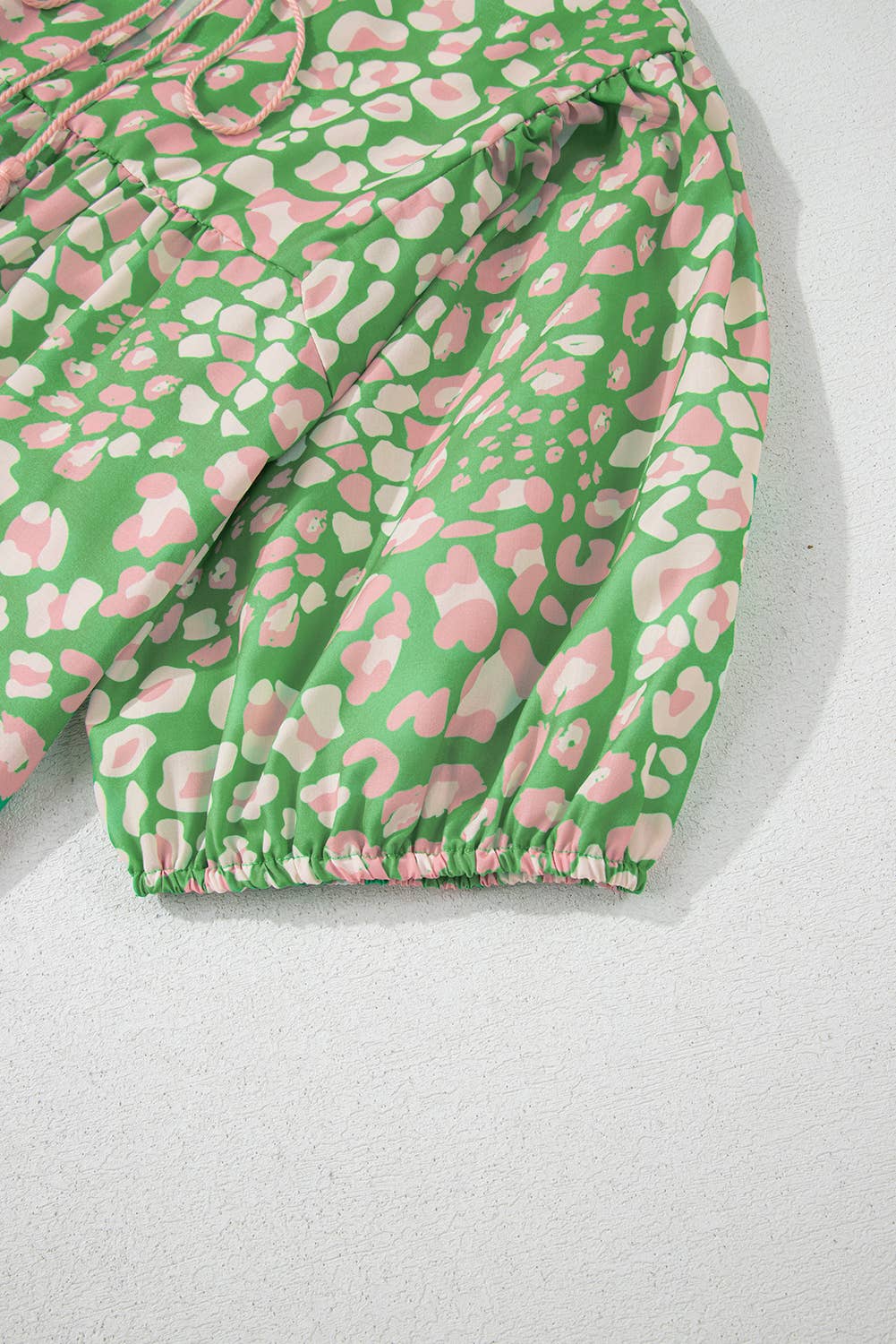 This blouse top is vibrant with a bright green hue and pattern. Features a flattering split neck design with tassel ties. Puff sleeves add a touch of femininity and chic style. Perfect for pairing with jeans or a skirt for a versatile outfit.