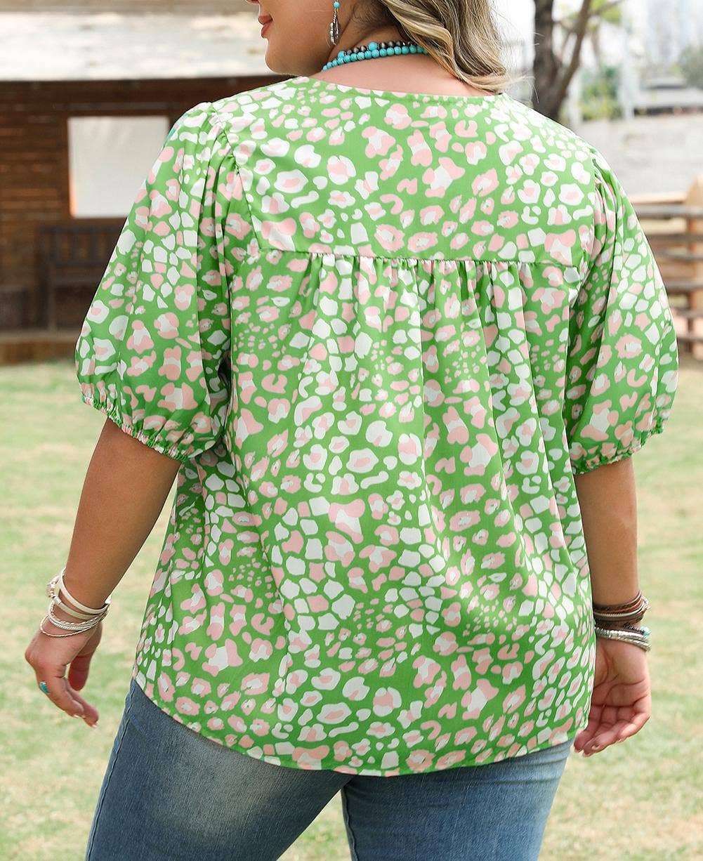 (Plus Tops) Floral Tassel Tie Split Neck Puff Sleeve Blouse (P-TTF11)