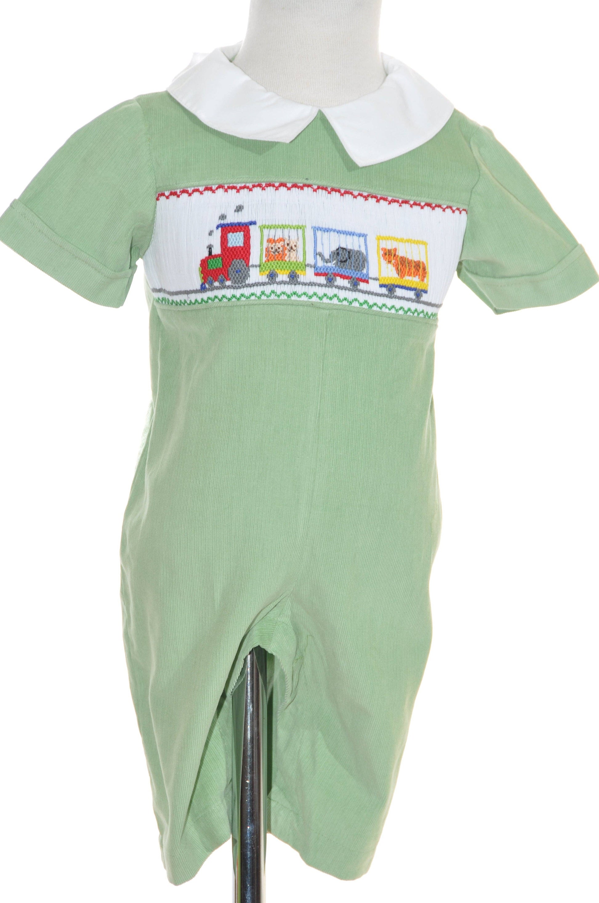 Dress your little one in comfort and charm with this Sage Green Corduroy Animal Train Smocked Boy Romper.